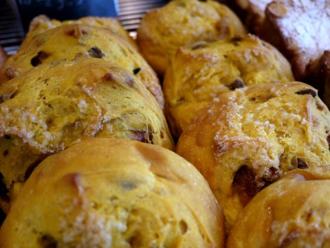 カボチャを練り込んだ生地に旬のりんごを蜜煮にして焦がしキャラメルを加えたもの、じっくりとワインに漬け込み甘さを引き出したレーズン、とこの時季においしいものを詰め込んだパンです。