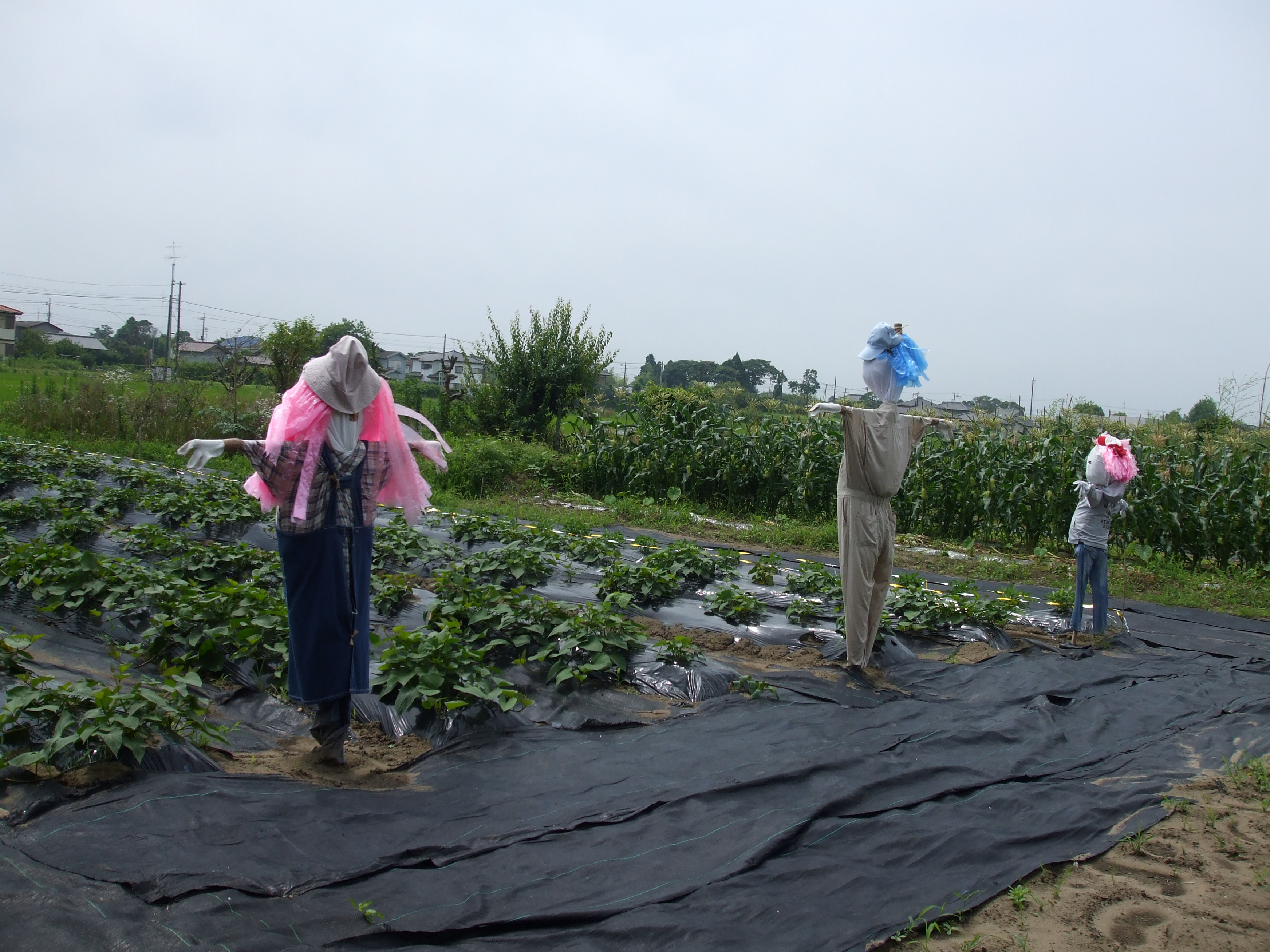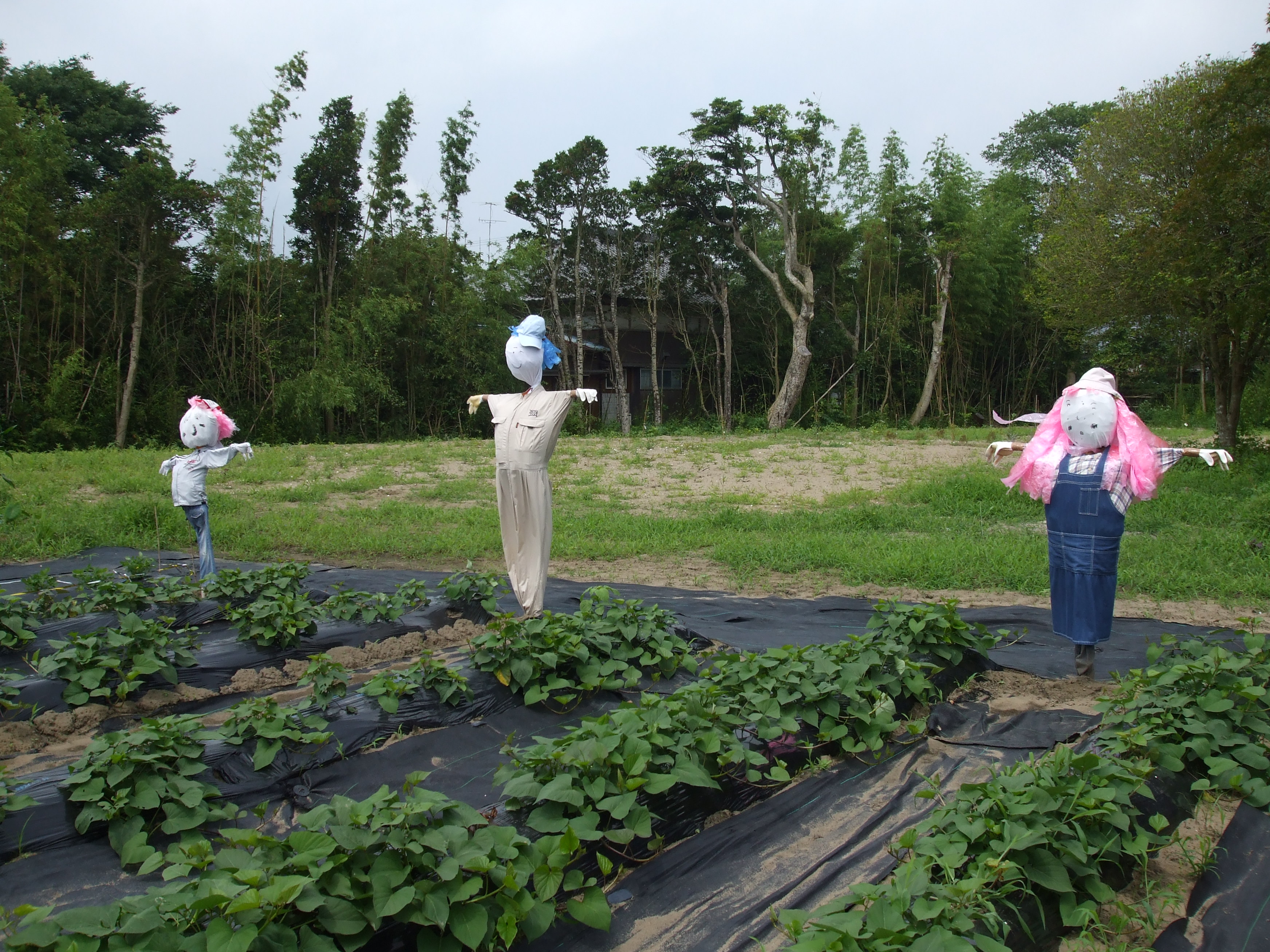 ゛白里幼稚園ママさん達の力作゛畑の番人が立派に仕事をしています。  う~ん、わたしもがんばらなくちゃ。(けっこう単純です。) このなすとトマトを使っておいしいぱんをつくるぞー。(したたかなところもあります。)  「ぎょっ!」←なすさん、トマトさんの声。