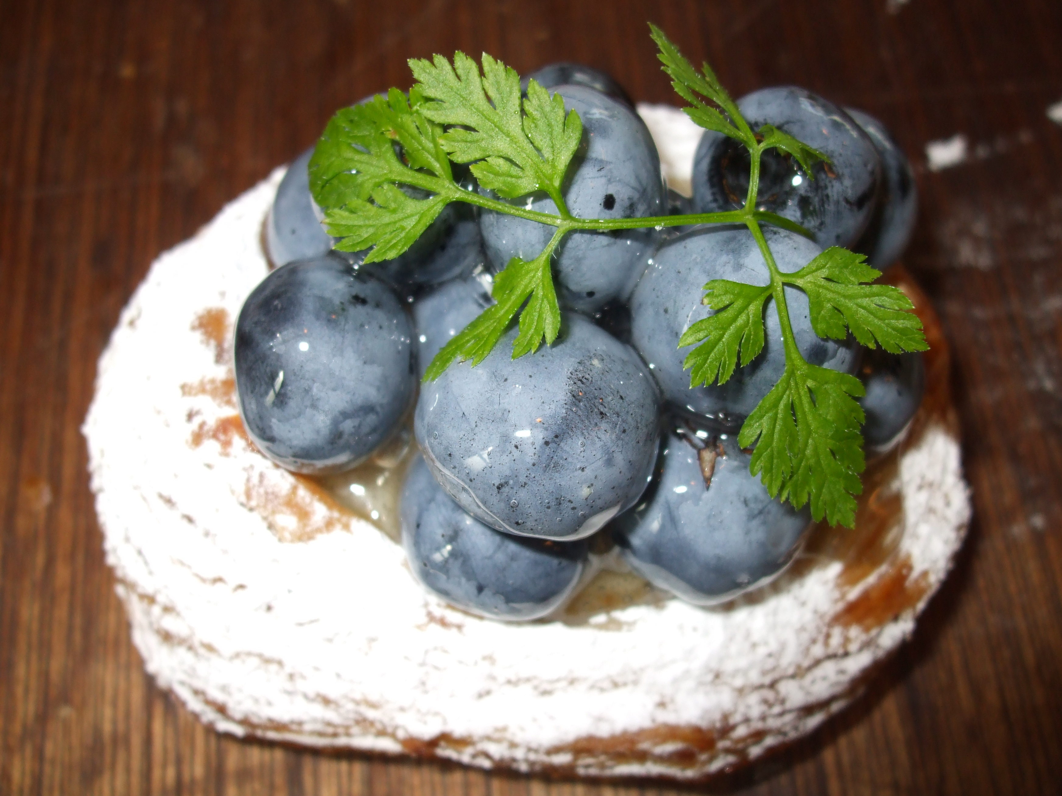 粉桜でもそんなブルーベリーが少しですが並んでいます。 まずは岩瀬さんの‘ロイヤルブルーベリー’。 ロイヤル?! 大粒でふっくら丸くて気品高く、その姿かたちには思わず「ロイヤルー」とうなります。 一粒つまんで口に入れれば「ん~、ロイヤル」とため息です。 そのブルーベリーを山盛りにしてデニッシュにしてみました。 ブルーベリーの下には粉桜特製のカスタードクリーム&チーズクリームです。